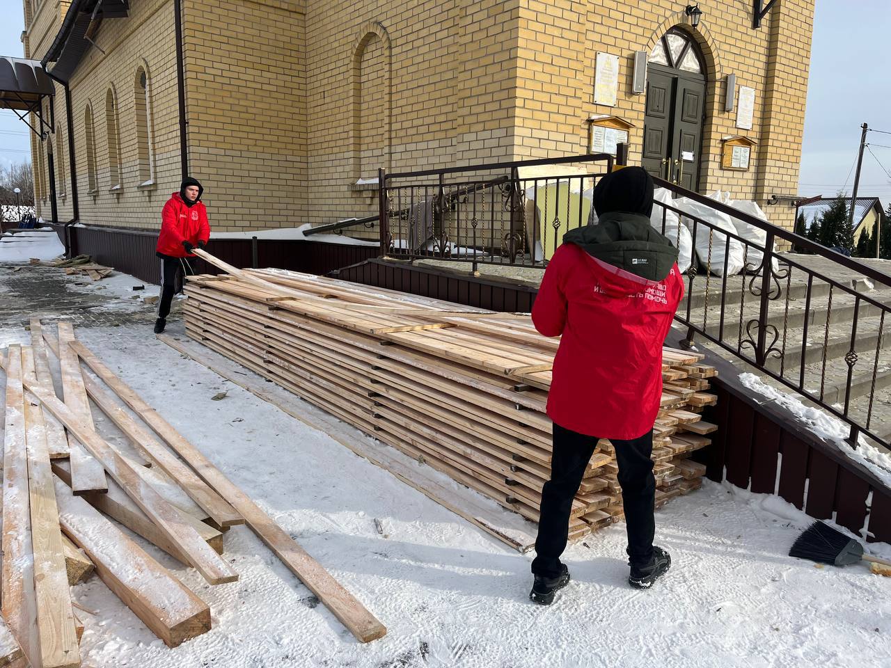 В поселке Выгоничи Брянской области расчищают территорию храма, который был атакован ракетами Вооруженных сил Украины. Помощь оказало местное отделение «Волонтерской роты». Добровольцы переносят пиломатериалы, выносят поврежденный кирпич, сообщается в телеграм-канале активистов.