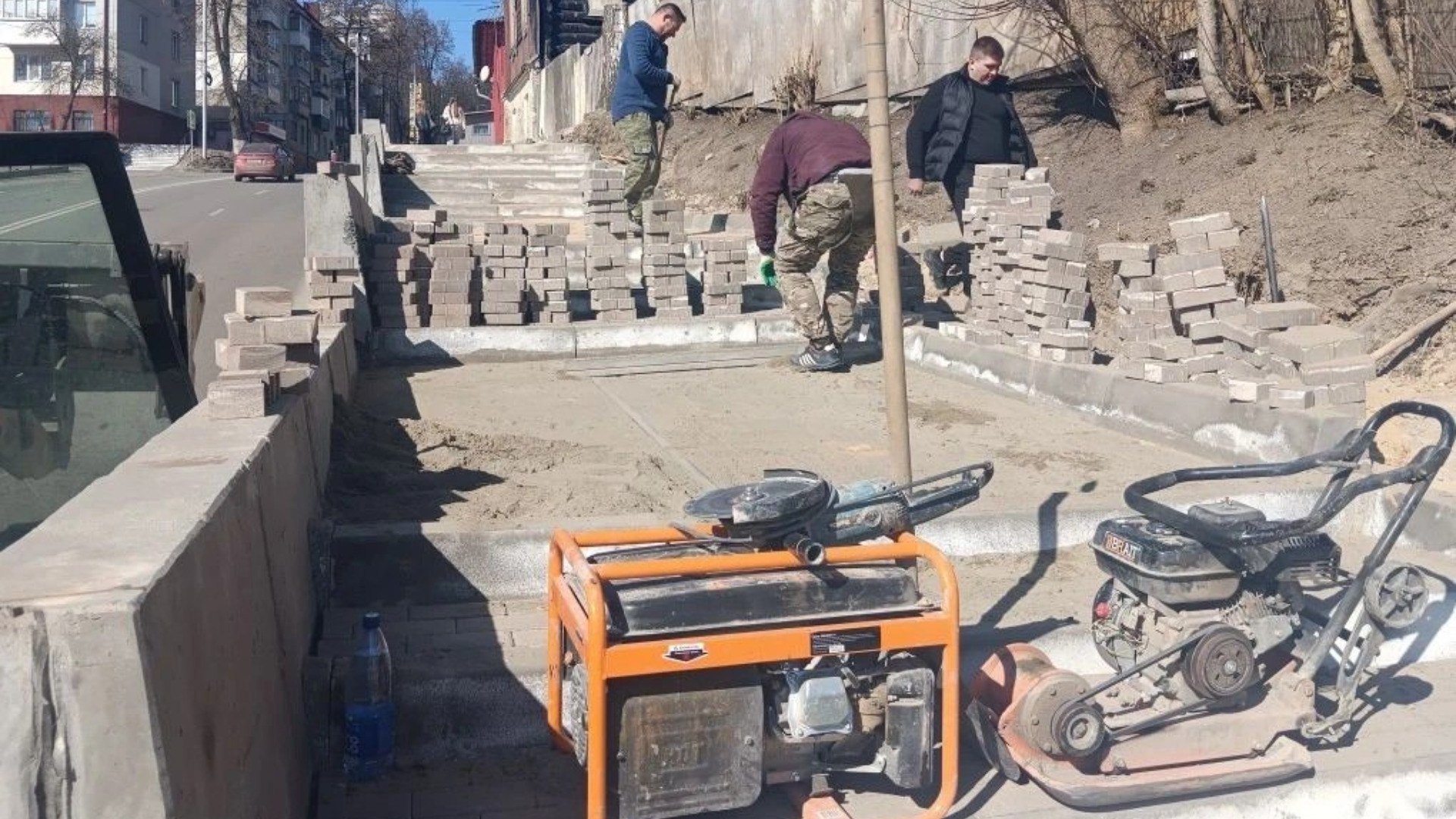 Подрядная организация "Автодор" приступила к выравниванию тротуарной плитки на строящемся участке улицы Горького в Брянске. Незначительная деформация покрытия произошла в зимний период из-за просадки высокого слоя насыпного грунта и особенностей ландшафта, что было предусмотрено техническими рисками проекта.