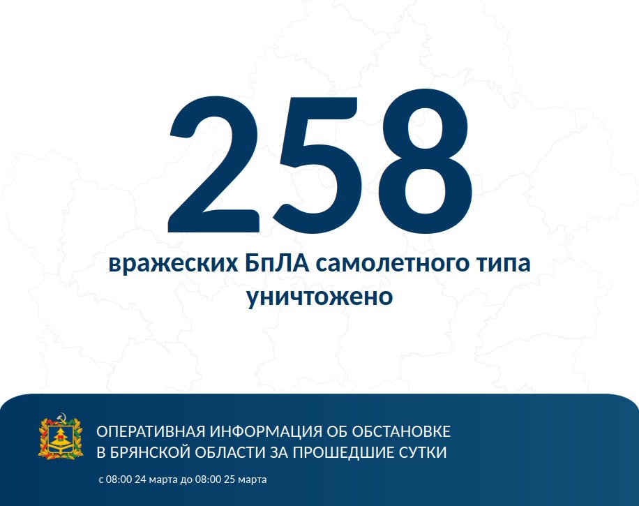 За прошедшие сутки с 8:00 24 марта до 8:00 25 марта над территорией региона уничтожено 258 вражеских БпЛА самолетного типа.