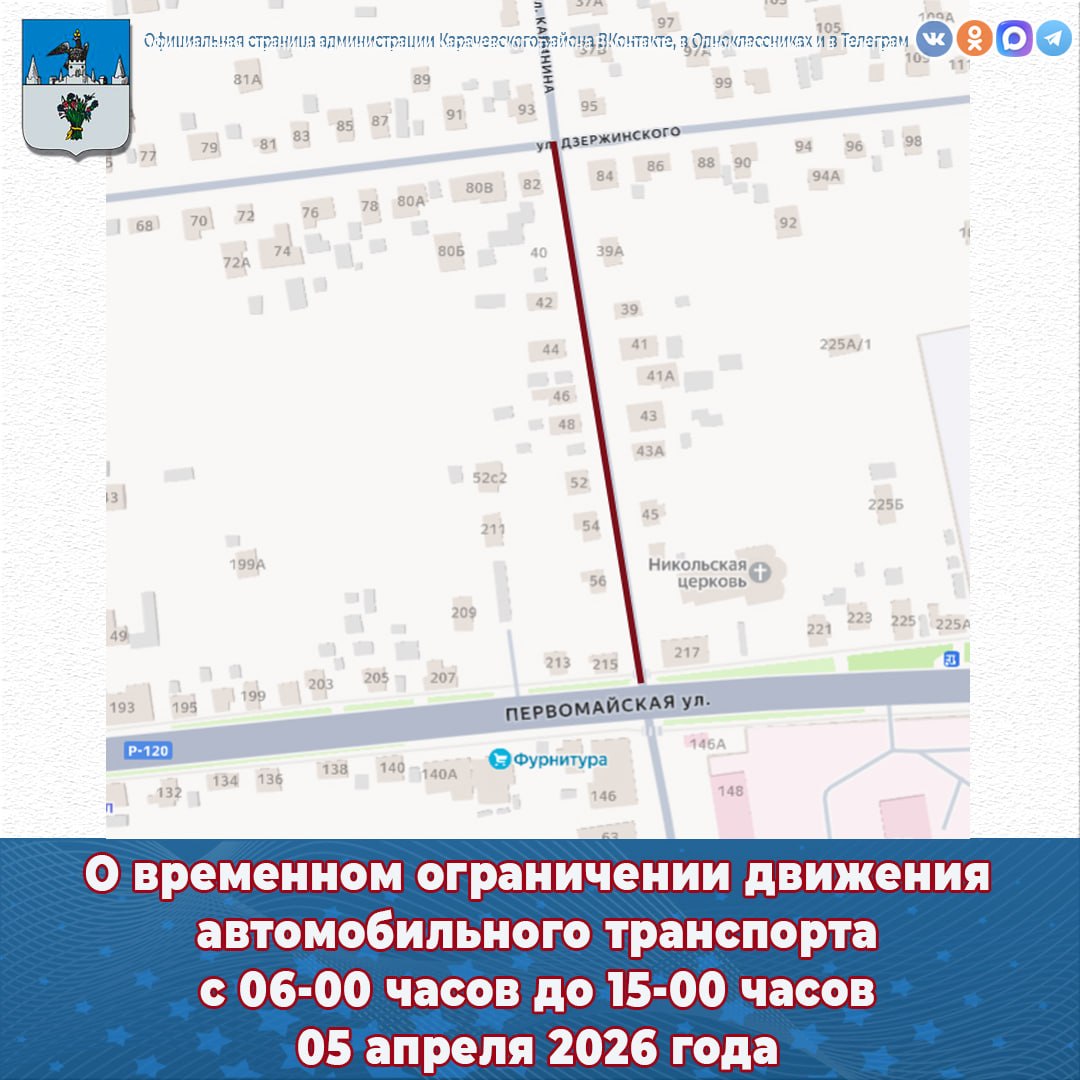 Будет перекрыто движение автомобильного транспорта на автодороге местного значения общего пользования с 06-00 часов до 15-00 часов 05 апреля 2026 года по ул. Калинина (от ул. Первомайская до ул. Дзержинского), ул. К. Маркса (от д. 15 «А» до д. 66) в г. Карачеве Брянской области.