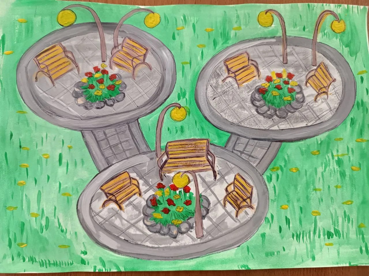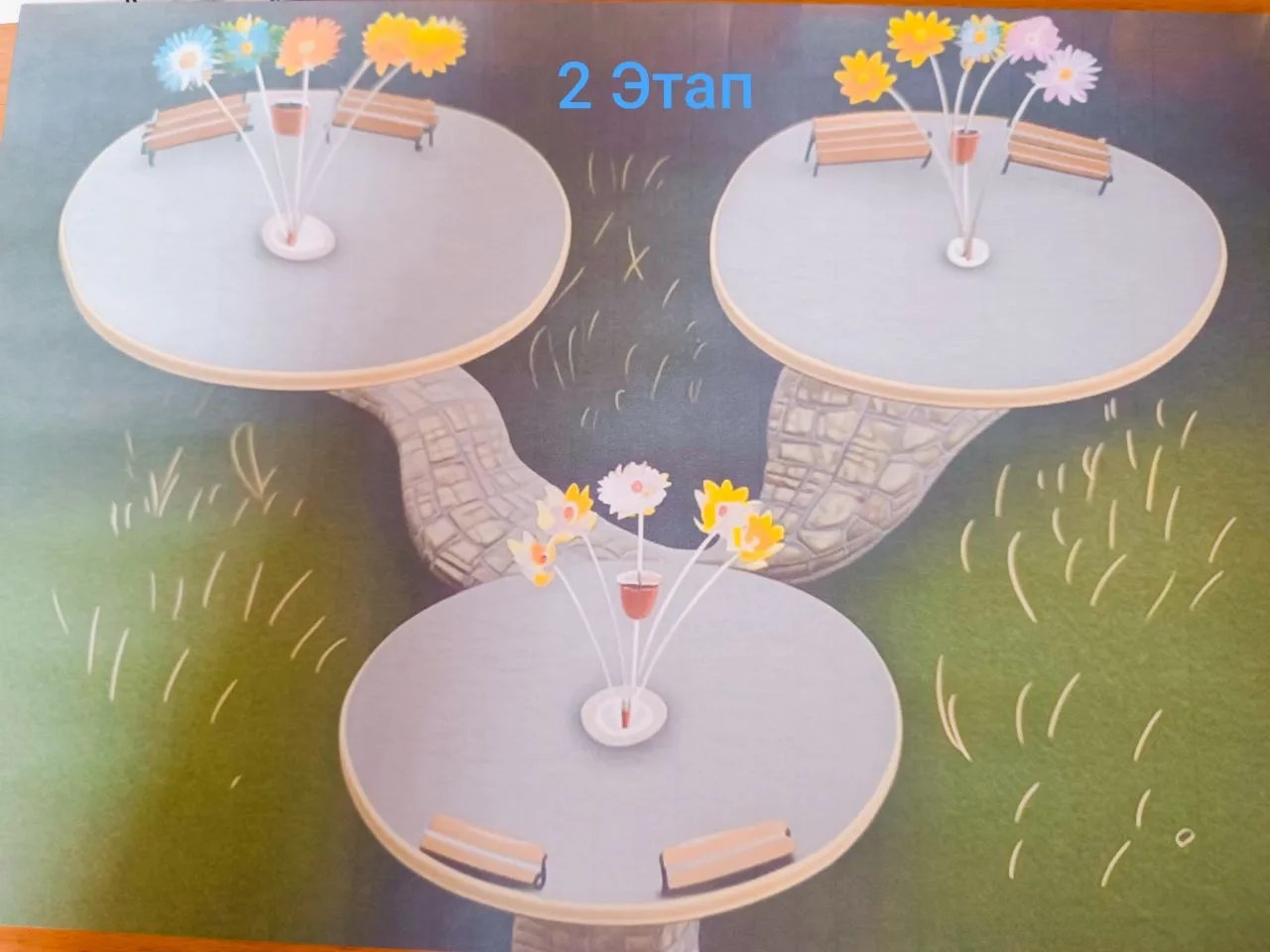 Рядом с площадкой для отдыха со световым фонтаном (1 этап) появятся уютные островки для отдыха, связанные дорожками, со скамейками и светильниками в виде одуванчиков на сумму 1146707 рублей.