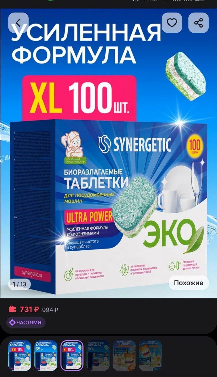 Таблетки для посудомоечных машин ULTRA POWER от бренда SYNERGETIC выделяются на фоне аналогичных продуктов благодаря своей высокой эффективностью и удобству в применении. В упаковке содержится целых 100 штук, что обеспечивает долгосрочную эксплуатацию и делает их отличным выбором для семей с активным образом жизни.