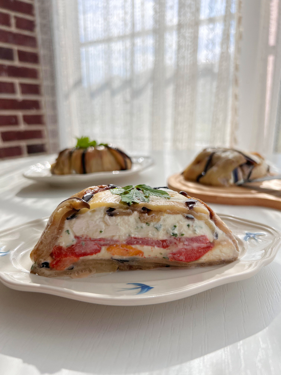 Этот аппетитный террин из баклажанов, запеченного перца и сыра привлекает внимание своей красотой и уникальностью. Удобно подавать его на праздничные мероприятия, и, конечно, не стоит менять предложенные ингредиенты в начинке. Замена творожного сыра на более влажные аналоги может сделать террин слишком мягким, что усложнит нарезку.