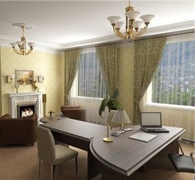 При оформлении небольшого кабинета важно избегать размещения рабочего места спиной к окну или двери. Это может создать неудобства — например, бликтующие на экран солнечные лучи. Следует позаботиться о правильной расстановке мебели и затемнении, если это необходимо. В просторных кабинетах, где размещено несколько рабочих мест, рекомендуется зонирование с помощью стеллажей или мобильных перегородок, которые позволяют сохранять гармонию и способствуют акустическому комфорту.
