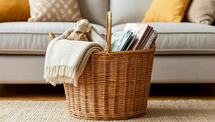 Начнем с того, что важно убрать визуальный беспорядок. Grab a large basket or bag and swiftly navigate through your home: from the hallway to the living room and kitchen. Собирать нужно все, что не должно находиться на виду — одежду, журналы, игрушки, пульты. Не тратьте время на организацию: просто соберите все в одну емкость и временно уберите в шкаф или кладовку. Освободите поверхности, чтобы столы, полки и стулья стали немного просторнее. Одно это действие создаст видимость порядка. Затем обратите внимание на пол: поднимите все лишнее, что там лежит, и тоже положите в корзину.