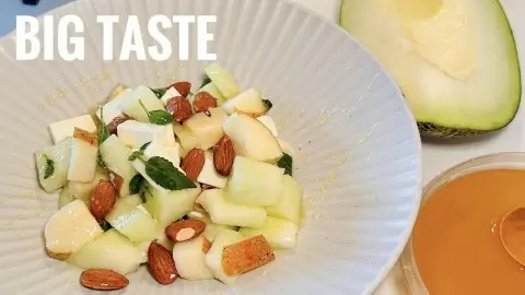 Такой салат станет отличным вариантом для легкого ужина или закуски на жаркий день. Дыня и груша в сочетании с сыром и хрустящим миндалем создают удивительный ансамбль сладости и пикантности, а свежая мята придаст финальный аккорд в этом гастрономическом произведении искусства.