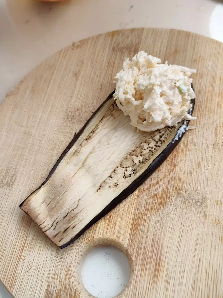 Для начинки необходимо натереть сыр на мелкой терке, добавить туда прессованный чеснок и заправить все сметаной. После того как баклажаны немного остынут, их можно аккуратно завернуть в рулетики, начиная с одного конца.