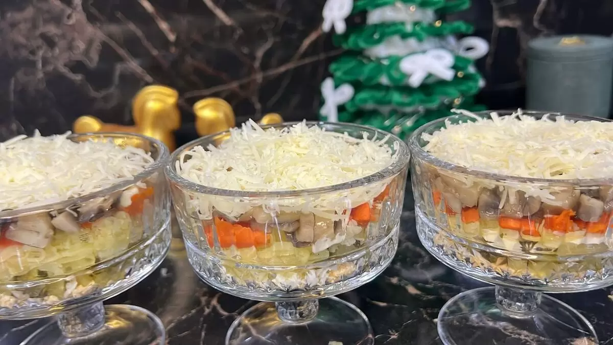 Сборка начинается с яиц, натёртых на крупной терке, затем идёт сетка майонеза, огурцы и ещё немного майонеза на слой; затем — картофель, снова майонез, грибы и завершающий слой сыра. Плавно переходя с слоя на слой, создает ощущение легкости и аккуратности на тарелке.