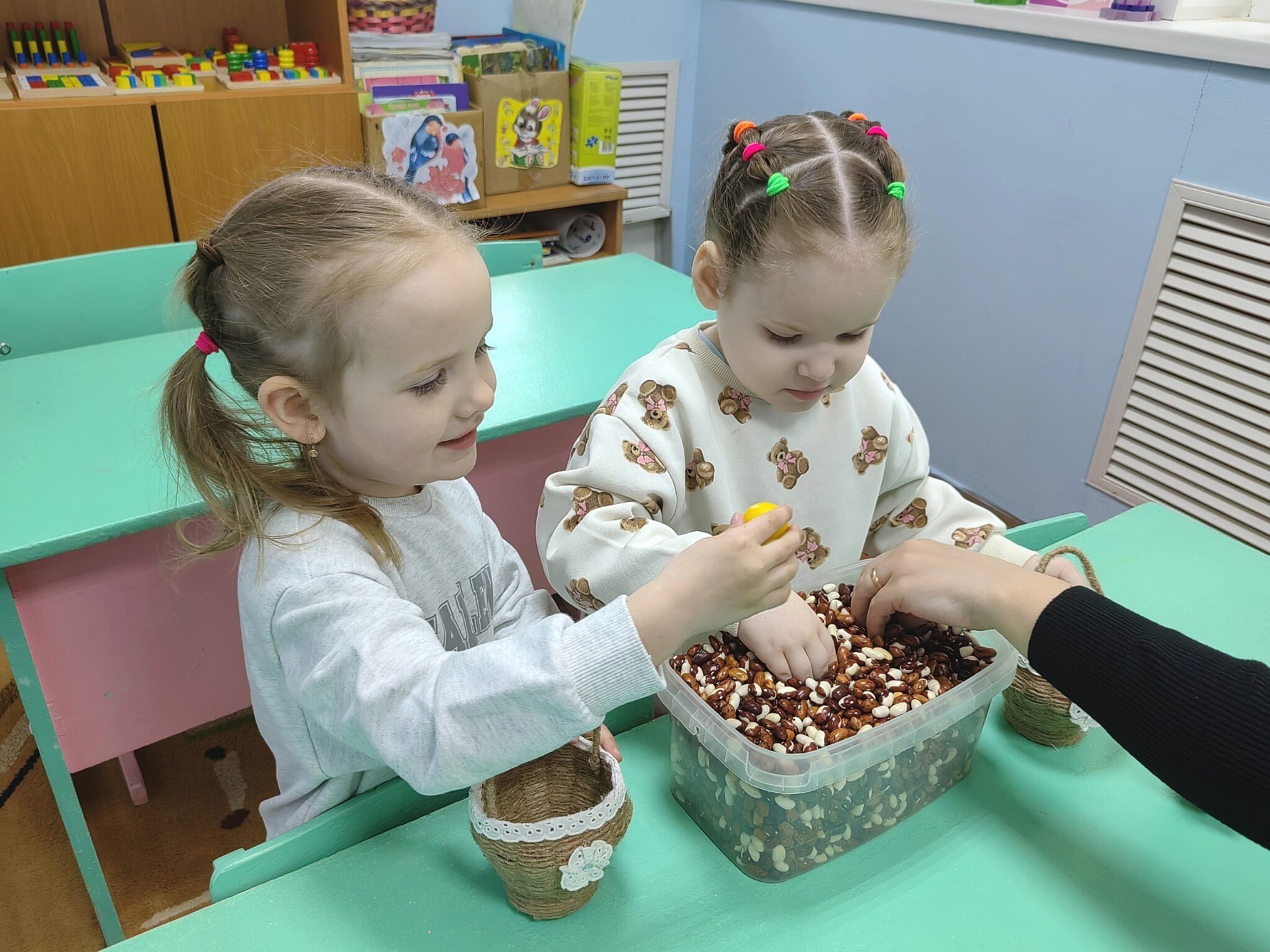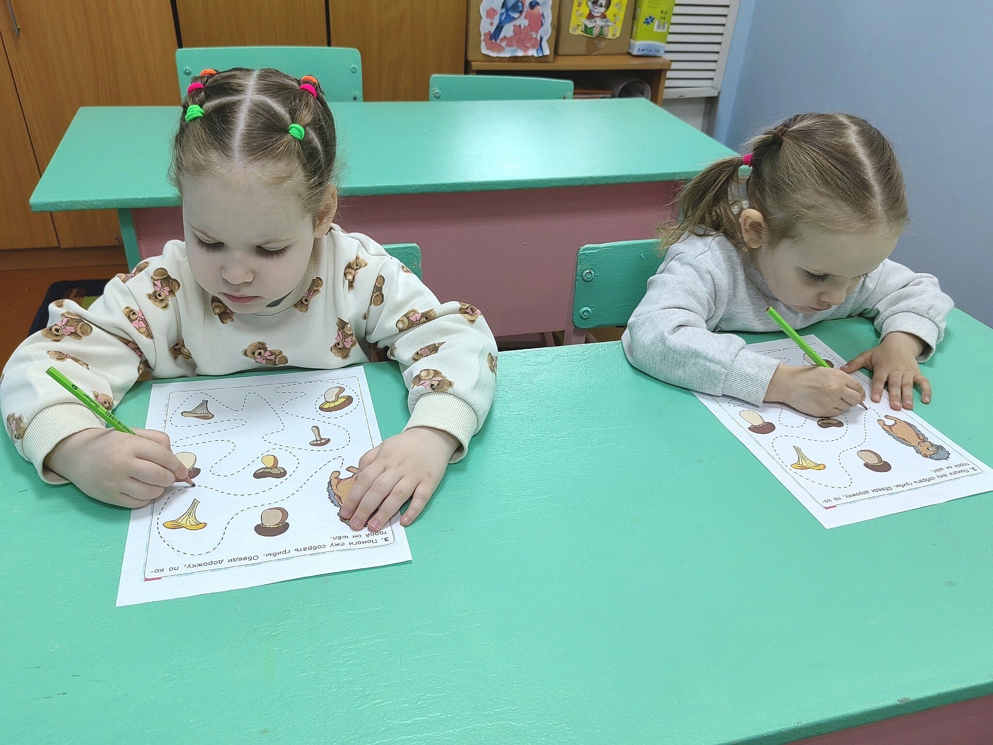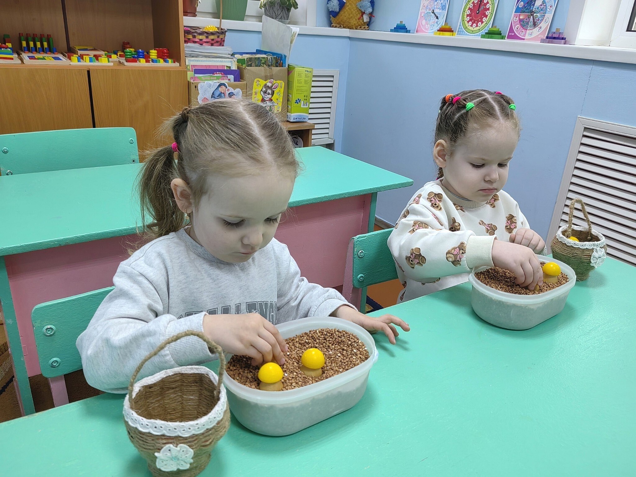 Вдохновленные праздничной идеей, малыши погрузились в захватывающее грибное приключение. Занятия были построены так, чтобы в игровой форме познакомить ребят с миром грибов. Дети учились различать грибы по названиям, находили их среди зерен фасоли, а затем «сажали» в гречневую крупу, словно настоящие грибоводы. Тренировали мелкую моторику и внимание с помощью игр: ежик «собирал» грибы по тропинке, а белочка «сушила» свои запасы, нанизывая грибы на веревочку. Чтобы закрепить полученные знания, малыши старательно расставляли грибы на волшебной полянке.