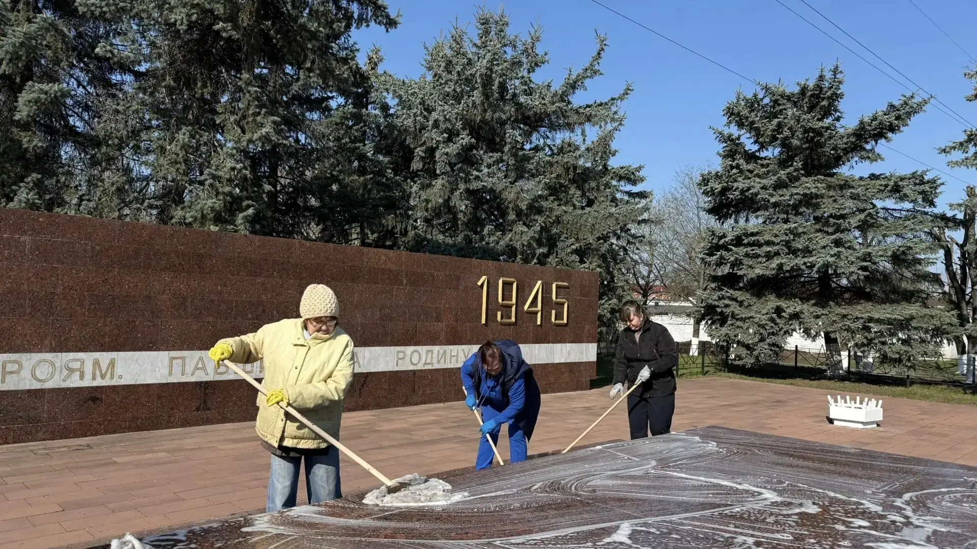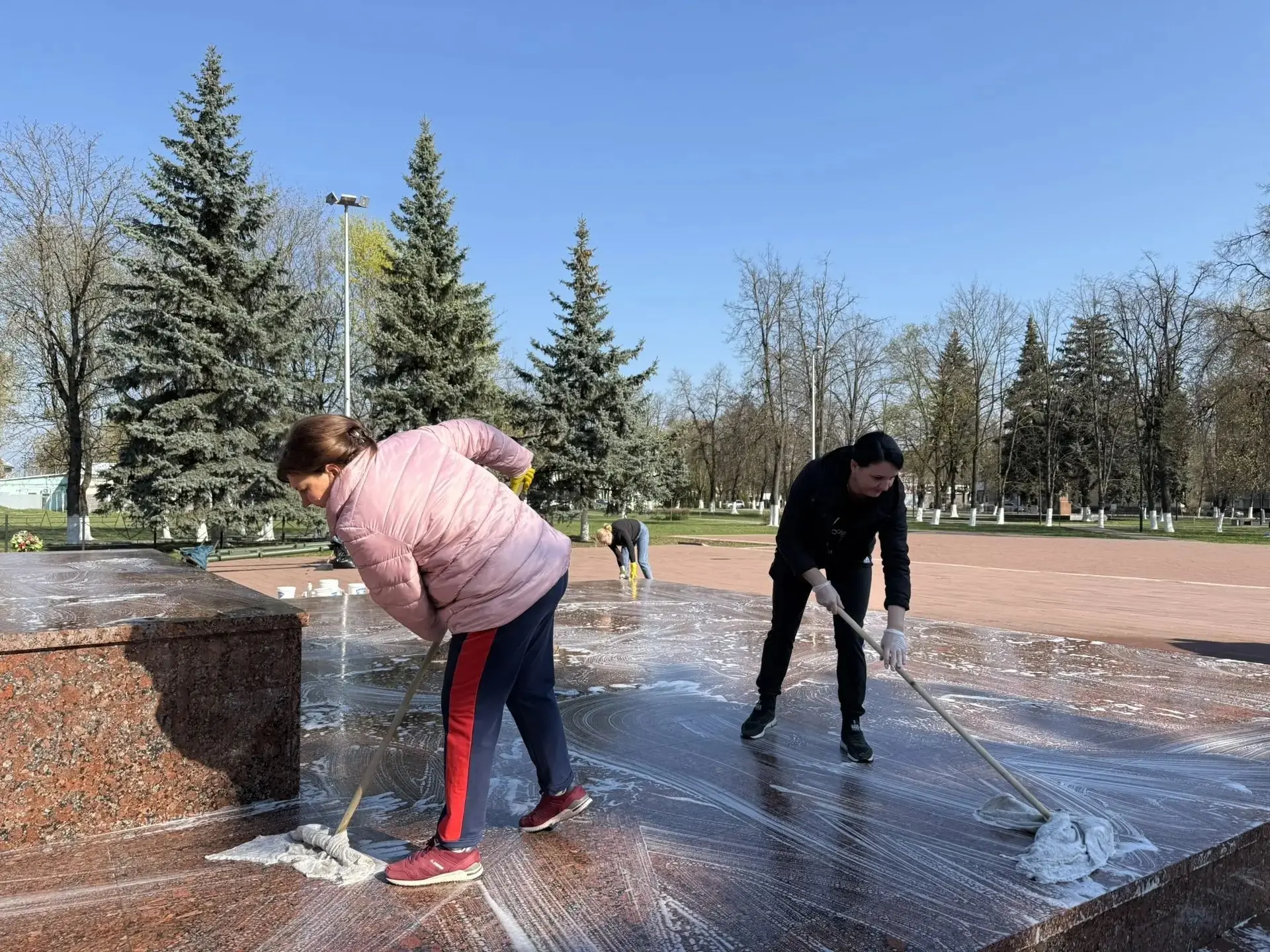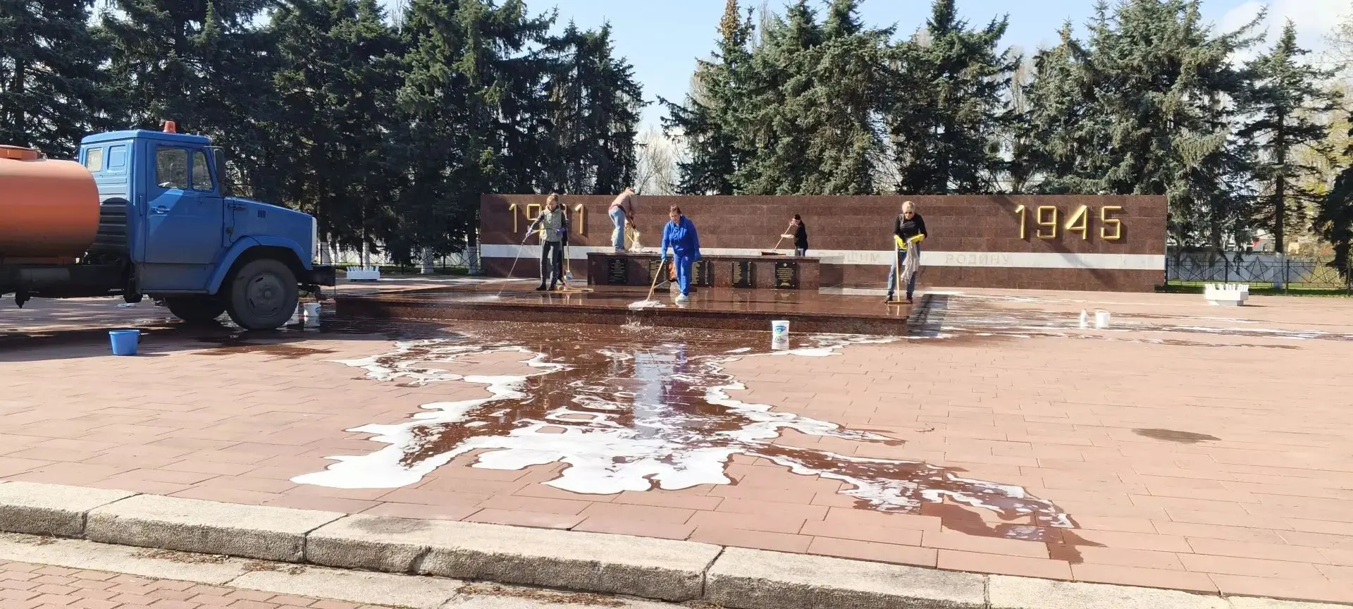 Прежде, чем его вымыли до блеска, сотрудники администрации подмели прилегающую территорию и с помощью моющего средства вымыли все гранитные плиты.