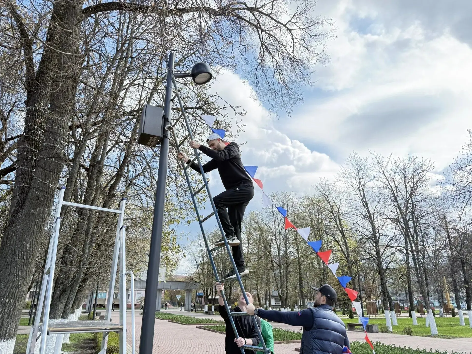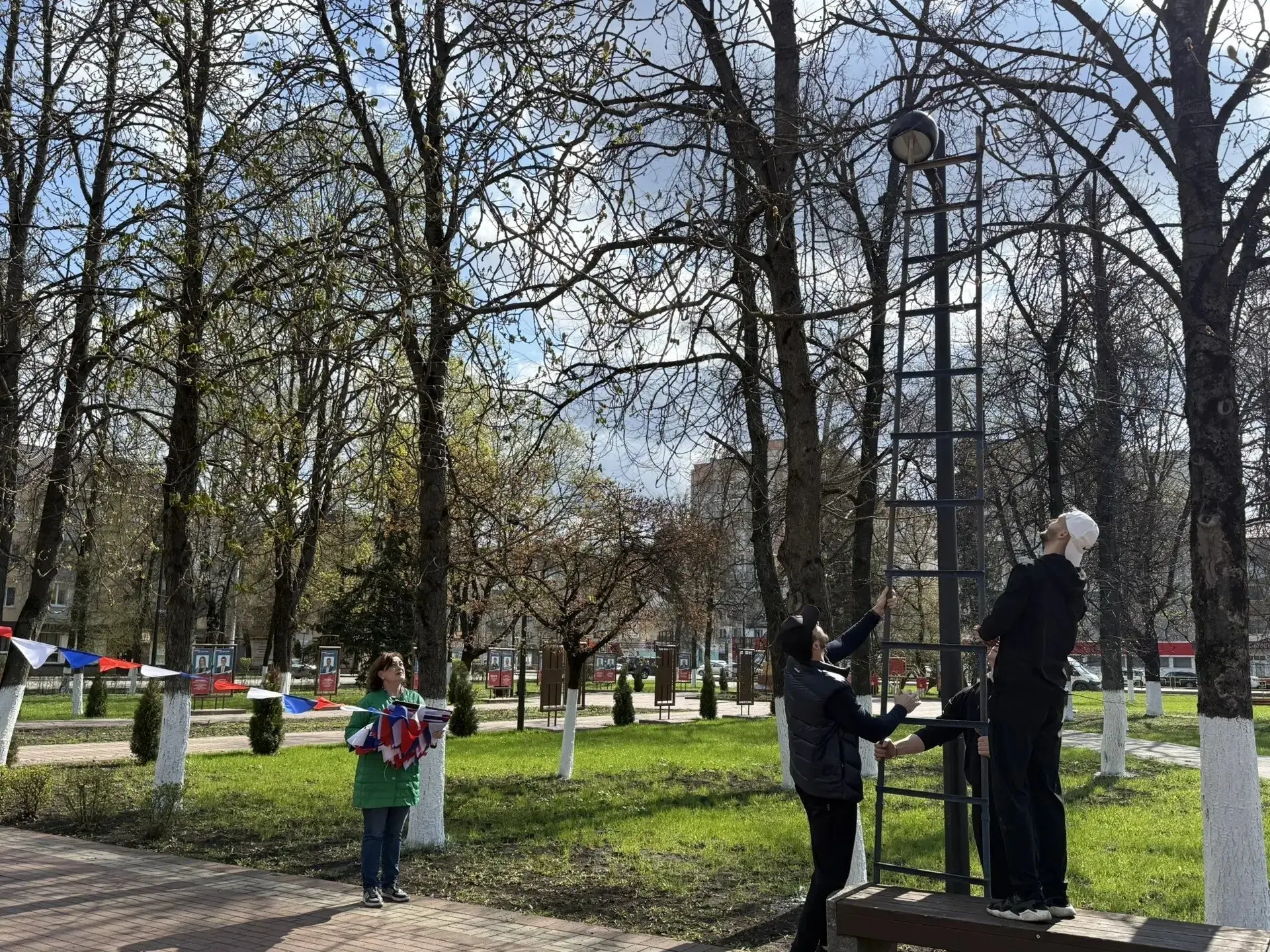 Затем участники субботника приступили к украшению сквера Ленина — над центральными аллеями были развешены разноцветные флажки.