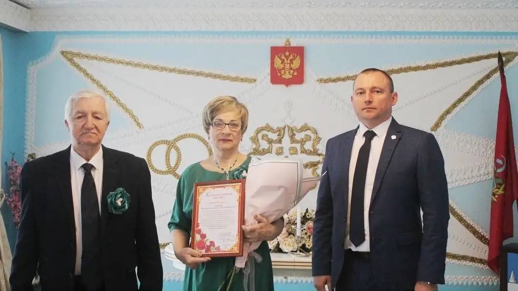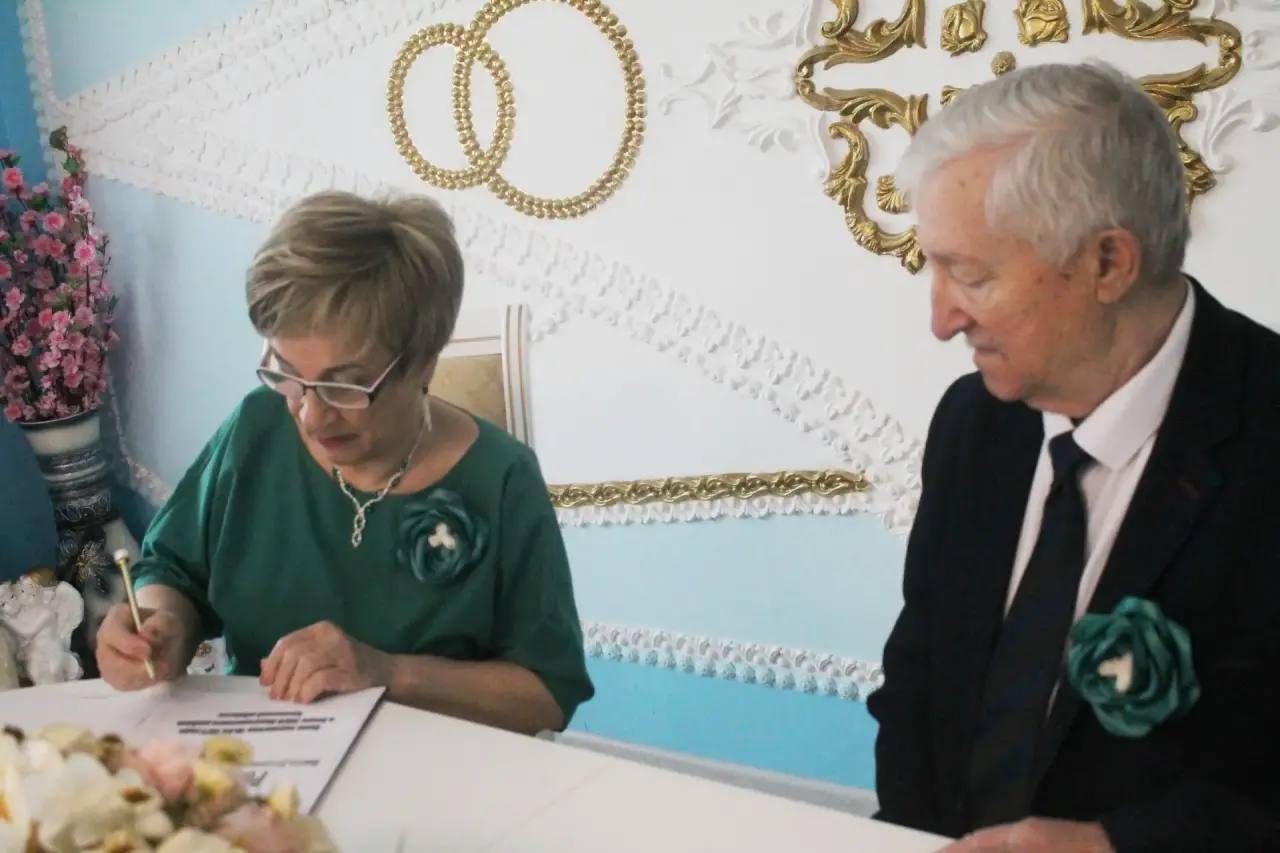 Начальник отдела ЗАГС Елена Антощенко тепло поздравила супругов с этим прекрасным событием. Супружеская пара оставила памятную запись в Книге почетных юбиляров.