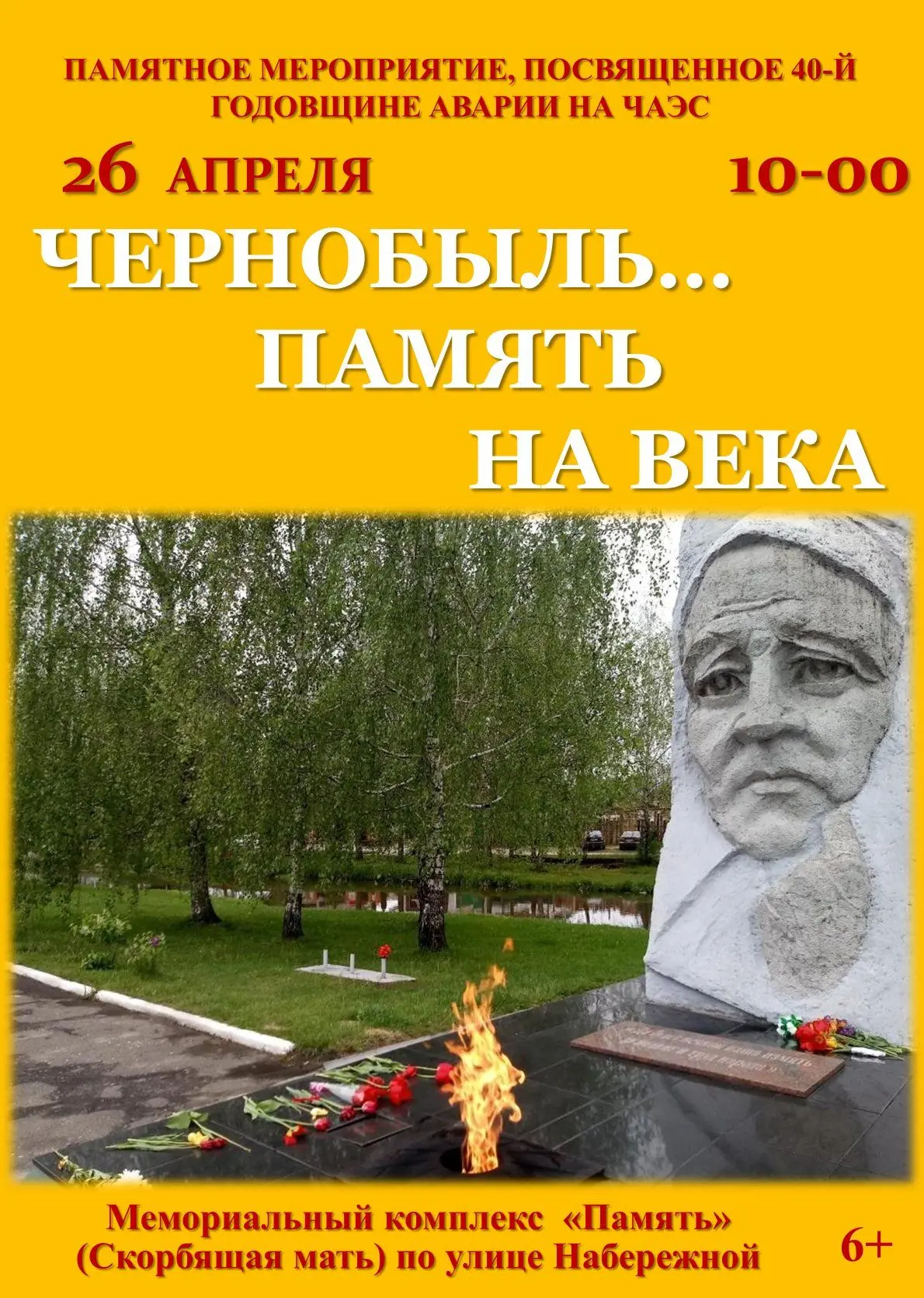 Приглашаем вас принять участие в памятном мероприятии, посвящённому 40й годовщине аварии на Чернобыльской АЭС, которое состоится 26 апреля в 10:00 у мемориального комплекса «Память» («Скорбящая мать») по улице Набережной.