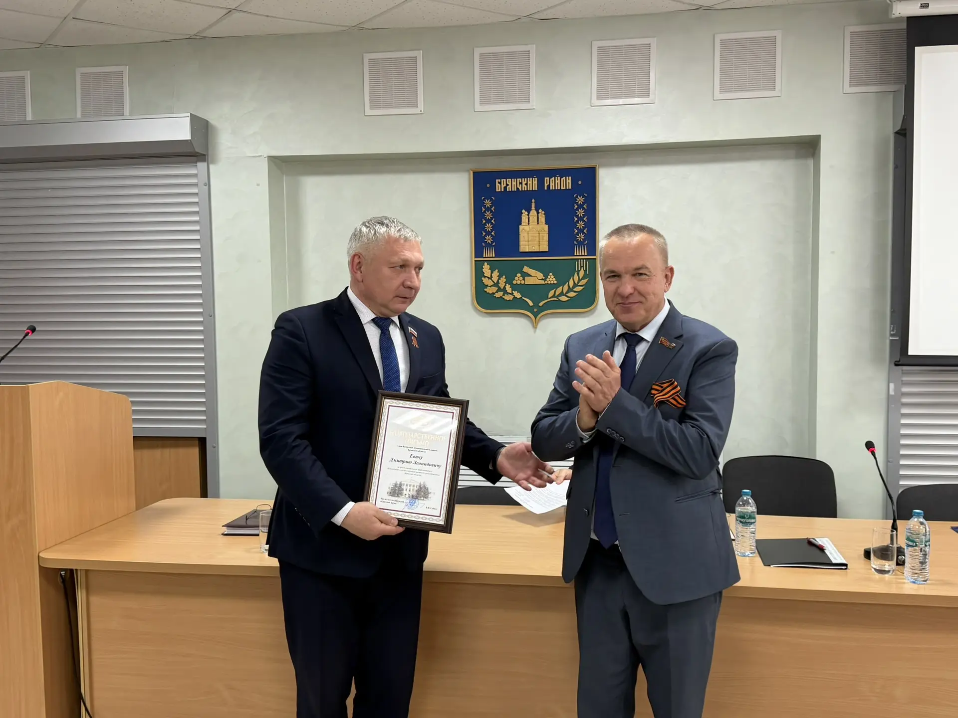 По завершении рассмотрения вопросов повестки дня заместитель председателя Брянской областной Думы Николай Якушенко вручил главе Брянского муниципального района Дмитрию Евичу Благодарственное письмо Брянской областной Думы.