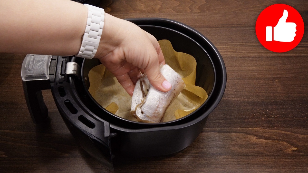 - В корзину аэрогриля выложите бумагу для выпечки, а сверху разместите подготовленные кусочки минтая. Хорошо распределите их, чтобы они не касались друг друга.
