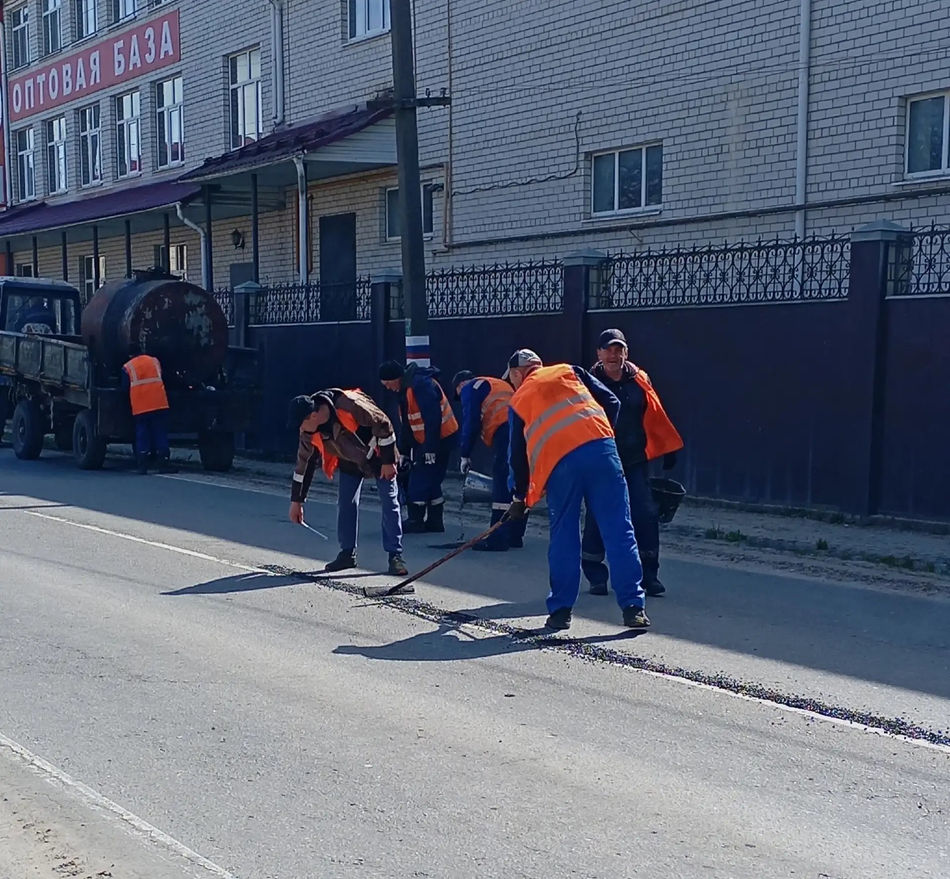 В этот погожий день продолжается и ямочный ремонт. Сегодняшний объект-улица Первомайская. Символичное совпадение в период подготовки к празднику Весны и Труда 1 Мая.