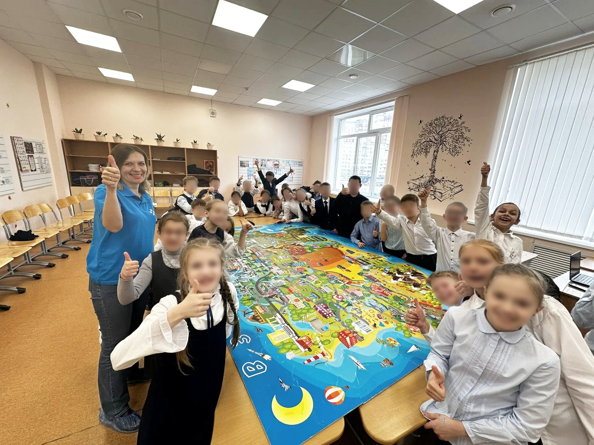 Игра с самого начала заинтересовала учеников начальных классов. Дети собирали большие пазлы, чтобы увидеть общую карту страны «Взросляндии», на которой собраны все профессиональные сферы. Совместно со специалистом ребята разбирали элементы карты, искали здания больницы, пожарной части, полиции и администрации и тут же рассуждали о том, кто там работает. Также на карте нашлись всеми любимые мультипликационные герои, что особенно порадовало «маленьких исследователей».