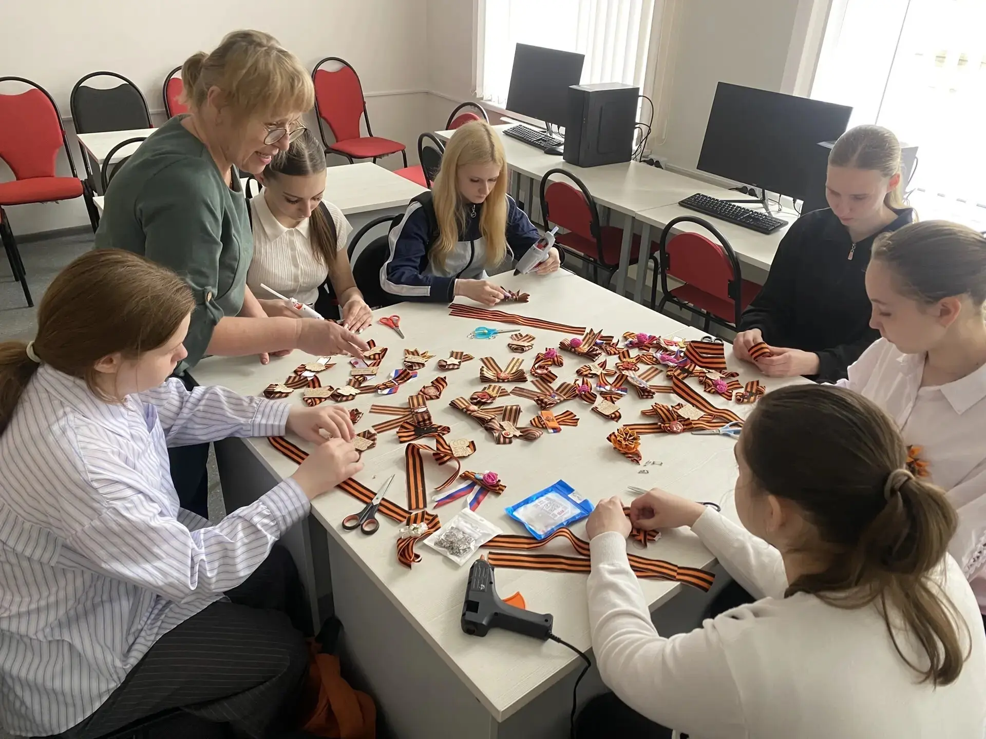 Обучающиесяволонтёры Выгоничской школы вложили душу и тепло своих рук в создание праздничных георгиевских лент!