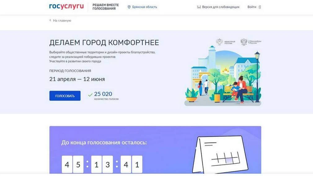 В нашем регионе продолжается Всероссийское голосование по отбору общественных территорий для благоустройства. Жители Брянской области традиционно демонстрируют высокую активность. Так, к 13:00 вторника, 28 апреля, свой выбор сделали более 25 тысяч человек, как следует из данных на интернет-ресурсе голосования. Напомним, сбор голосов для выбора лучших, по мнению жителей, проектов проводится в рамках федеральной программы «Формирование комфортной городской среды», которая входит в национальный проекта «Инфраструктура для жизни».