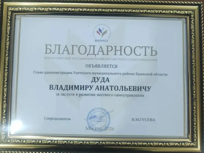 С гордостью спешим отметить, что главе администрации Унечского района В.А.Дуда была вручена благодарность Всероссийской ассоциации развития местного самоуправления за заслуги в развитии местного самоуправления.