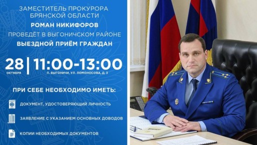 Заместитель прокурора Брянской области Роман Никифоров проведет выездной прием граждан в Выгоничах. С людьми представитель надзорного ведомства встретится 28 октября. подробнее