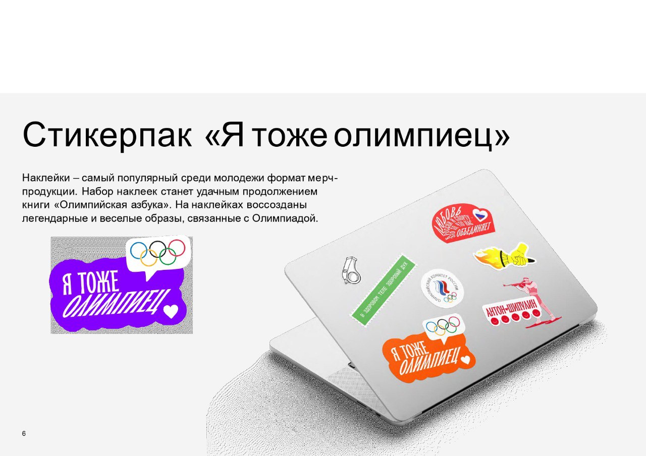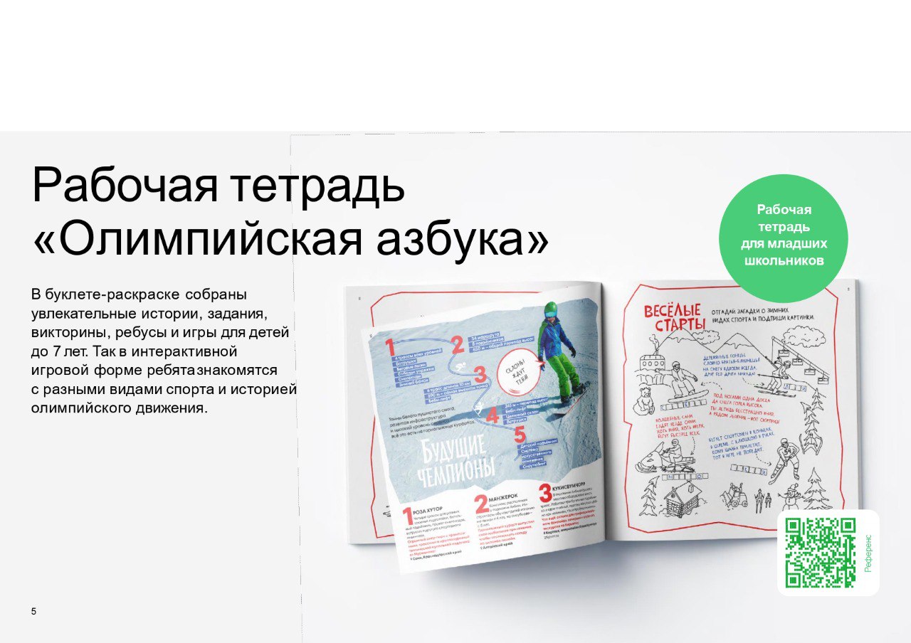- Книжно-журнальная продукция «Рабочая тетрадь к Олимпийской азбуке» для детей младшего школьного возраста. Тетрадь включает в себя иллюстрации и интерактивные задания, популяризирующие спорт и здоровый образ жизни.