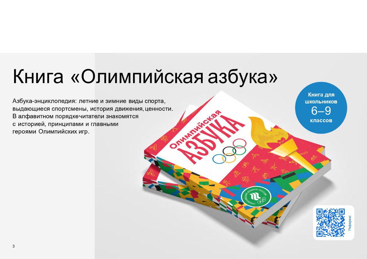 - Книжное издание «Олимпийская азбука», содержащее систематизированную информацию об олимпийских видах спорта, выдающихся спортсменах, историческом развитии олимпийского движения