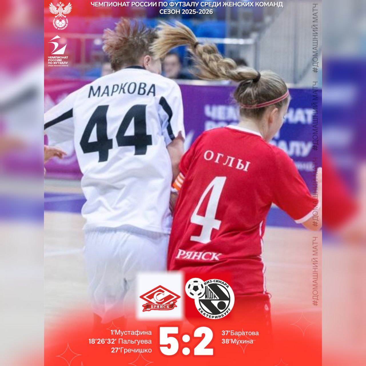 Повторный матч чемпионата России по футзалу среди женских команд (Высшая Лига) 9 февраля вновь принёс успех команде футбольной Академии Брянского городского спортивного комбината «Спартак». Как и накануне во Дворце Единоборств имени Артёма Осипенко соперник- «ВИЗ-Синара» (Екатеринбург) побеждён- 5:2. Голы забили: Ксения Пальгуева- 3, Виктория Мустафина и Анастасия Гречишко. В воскресенье счёт был 3:0.